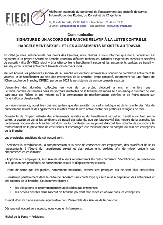 En cette journée internationale des droits des Femmes, nous tenions à vous informer que notre Fédération est signataire d’un projet d’Accord de Branche (Bureaux d’études techniques, cabinets d’ingénieurs-conseils et sociétés de conseils – dite SYNTEC) relatif « à la lutte contre le harcèlement sexuel et les agissements sexistes au travail », sur lequel nous avons activement travaillé ces derniers mois.
